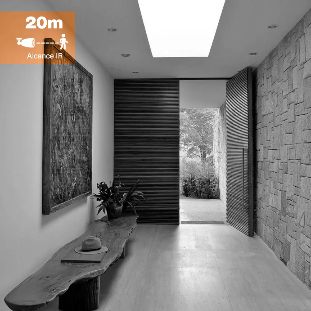 O iluminador infravermelho, invisível ao olho humano, possibilita um alcance de 20 metros. É ideal para lugares com pouca ou nenhuma luminosidade.